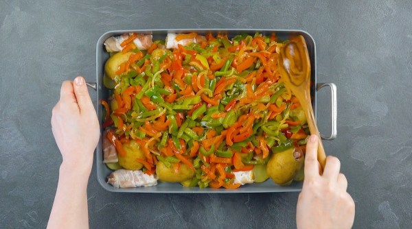 - Faites suer les poivrons et les oignons dans l'huile, salez et poivrez, puis étalez-les sur les pommes de terre dans le plat à gratin.