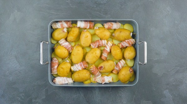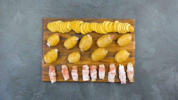 - Trempez les petits cornichons dans la moutarde et enveloppez-les dans du lard. Enfoncez un de ces rouleaux dans chaque pomme de terre découpée.