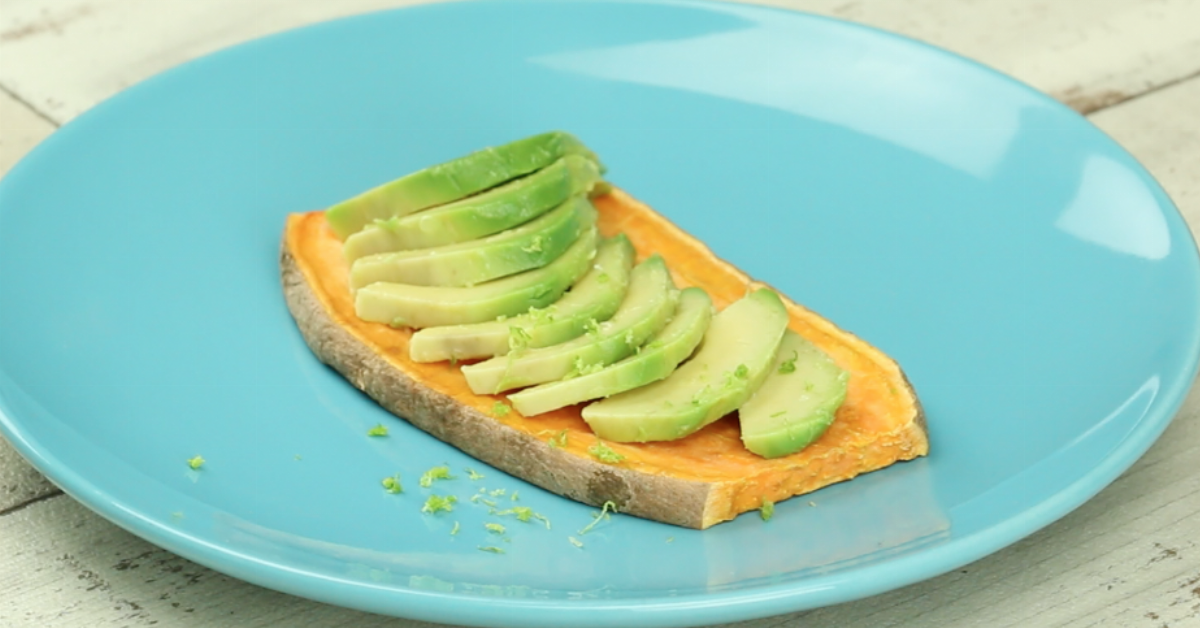 - Dès que les tranches de patate douce ont sauté du grille-pain, déposez les lamelles d’avocat dessus et râpez un peu de zeste de citron vert.