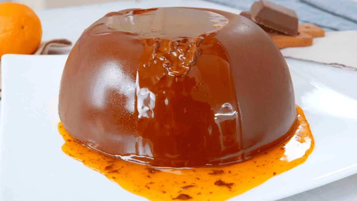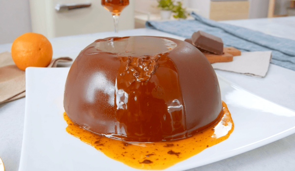 - Sortez le tiramisu à l'orange du réfrigérateur et renversez-le. Juste avant de servir, versez la sauce à l'orange chaude dans le creux, de sorte que le chocolat commence à fondre.
