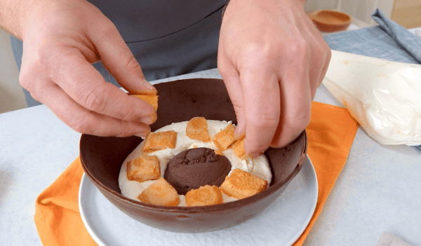 - Répartissez un peu de crème de fromage frais au fond de la coque en chocolat. Trempez l'un après l'autre quelques boudoirs dans de l'amaretto, cassez-les en morceaux et répartissez-les sur la crème de fromage frais. Recouvrez le tout d'une couche de crème de fromage frais et répartissez quelques morceaux d'orange dessus. Trempez brièvement d'autres boudoirs dans de l'amaretto et placez-les en une seule couche dans la coque en chocolat. Répétez les deux dernières étapes jusqu'à ce que la coque en chocolat soit remplie. Terminez par une couche de boudoirs. Mettez le tiramisu à l'orange au réfrigérateur pendant 4 heures.