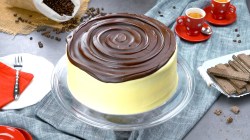 - Versez la ganache au café sur le gâteau et lissez le tout. Placez le gâteau sur un plateau tournant et dessinez une spirale dans la ganache à l'aide d'une petite spatule. Mettez le gâteau au frais pendant au moins 4 heures (de préférence toute la nuit).