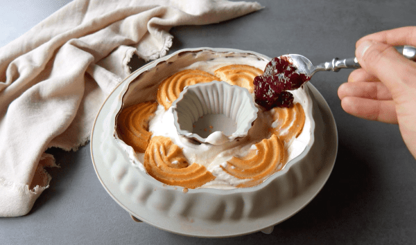 - Nappez maintenant le fond de la coque en chocolat avec la crème au mascarpone. Ensuite, placez les biscuits sur le dessus, arrosez de café et étalez la compote de fruits rouges sur le dessus.Astuce : Vous pouvez aussi tremper complètement les biscuits dans le café puis les déposer sur la crème de mascarpone pour intensifier l'arôme du café.