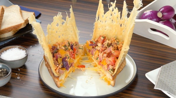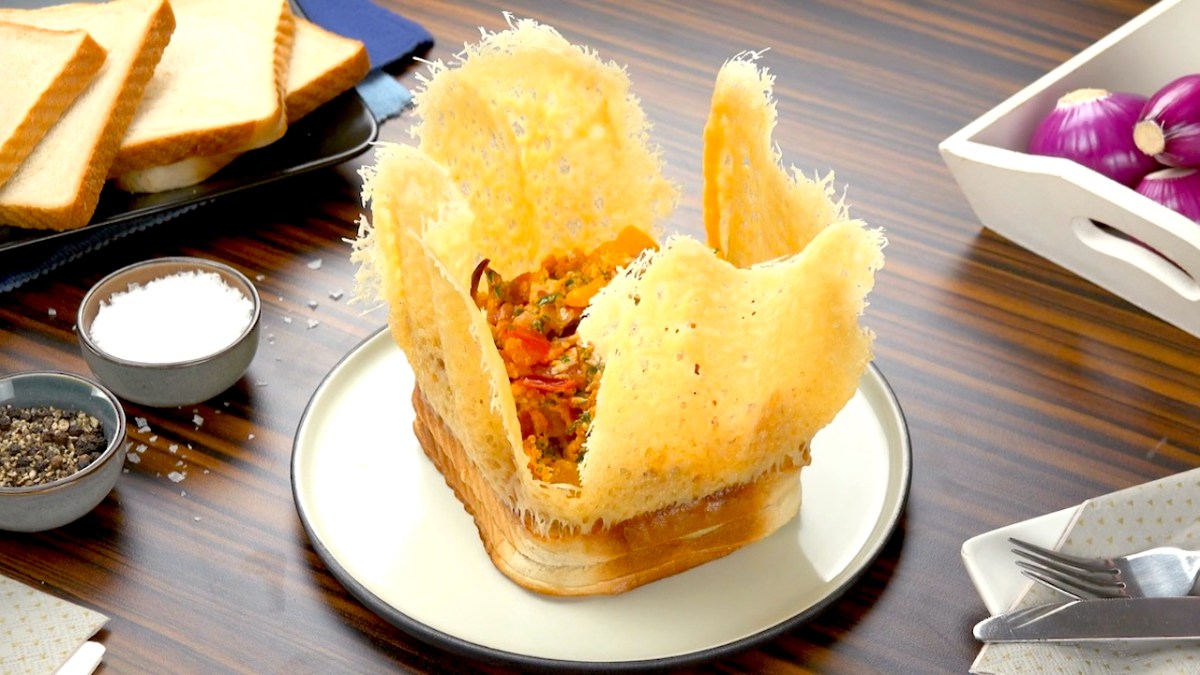 - Lorsque le parmesan a bien fondu, retirez-le soigneusement de la poêle avec le sandwich. Ensuite, placez soigneusement le toast sur un verre renversé afin que le parmesan durcisse ; cela prend environ 3 minutes.