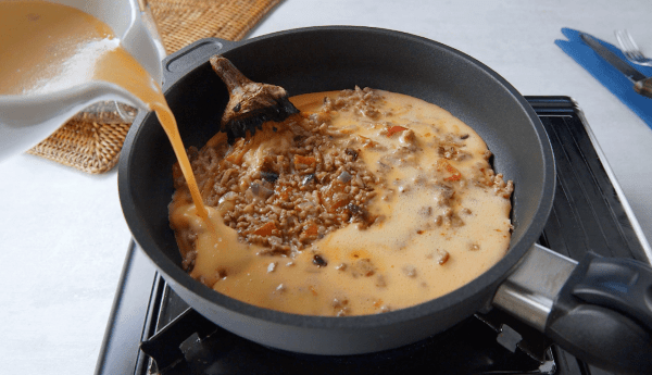 - Versez la moitié de la masse d'œufs dans deux poêles et déposez une des aubergines dans chacune d'elles. Répartissez la moitié du hachis sur chaque aubergine. Versez le reste de la préparation aux œufs par-dessus. Posez les couvercles sur les poêles et faites cuire le tout pendant environ 10 minutes à feu moyen.