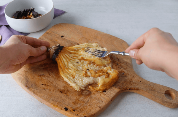 - Tenez les aubergines au-dessus d'une flamme (chalumeau) et laissez la peau se carboniser. Pelez ensuite complètement la peau (veillez à ce que le trognon reste intact). Aplatissez délicatement la chair de l'aubergine avec une fourchette.