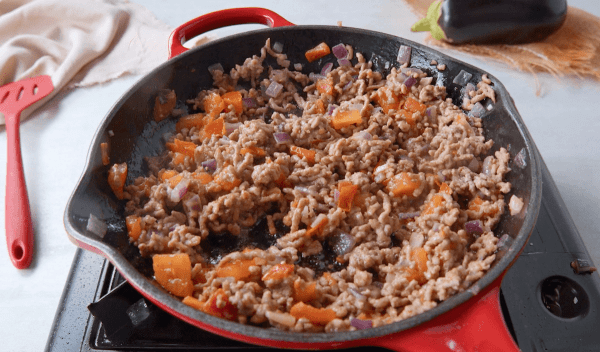 - Faites revenir les oignons, l'ail et les tomates dans de l'huile. Ajoutez ensuite la viande hachée et faites cuire le tout.