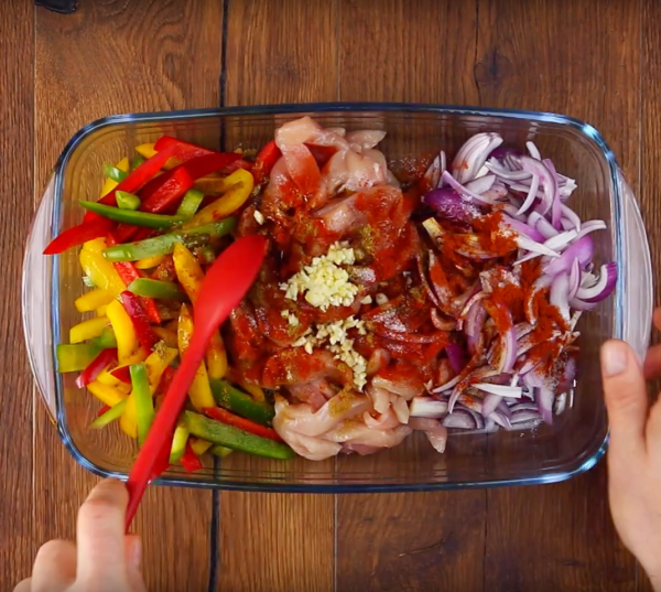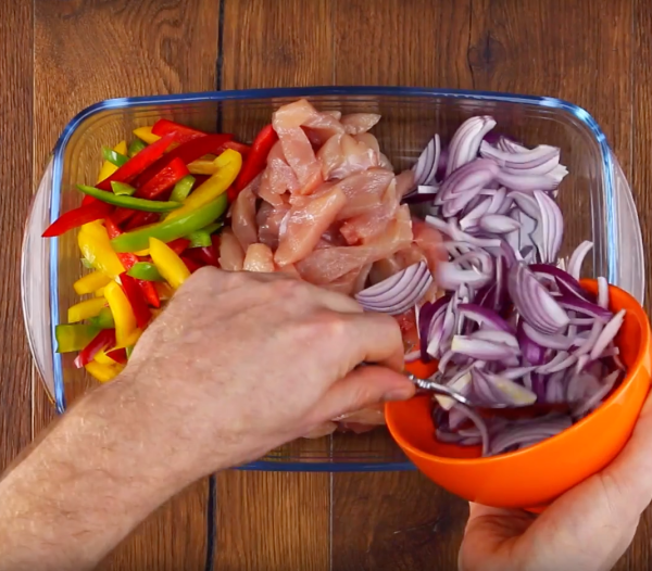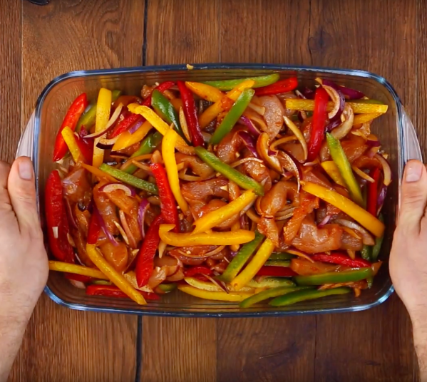 - Préchauffez le four à 200°C. Coupez la viande, les poivrons et l’oignon rouge en lamelles et déposez le tout dans un plat allant au four.