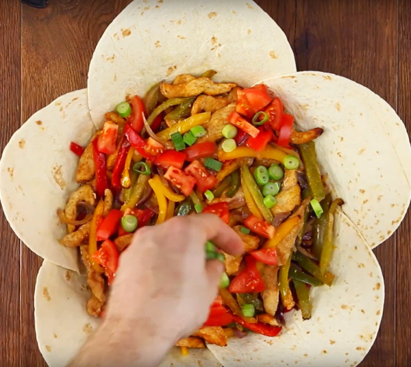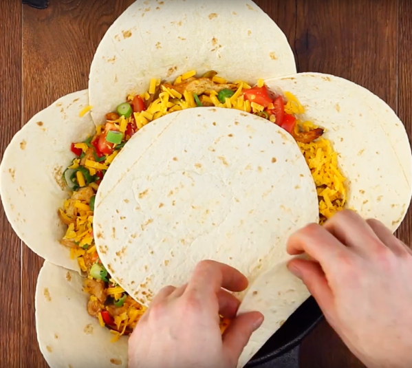 - La dernière tortilla vient se poser au-dessus de la préparation, comme un couvercle. Repliez maintenant les “pétales” de tortilla au centre de la “fleur”.