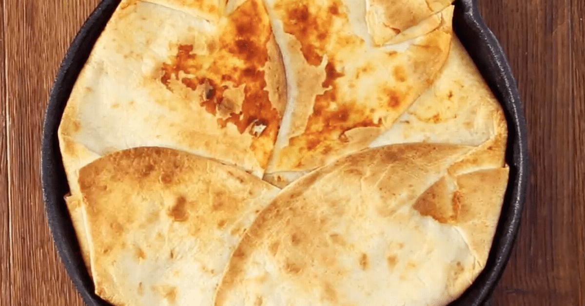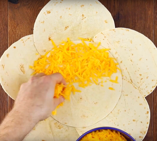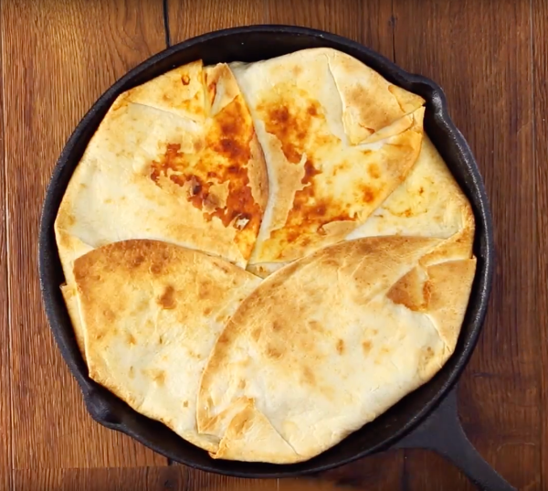 - Pendant ce temps, badigeonnez un plat rond allant au four avec de l’huile. Déposez quatre tortillas tout autour de la poêle et une au milieu pour avoir la forme d’une fleur.