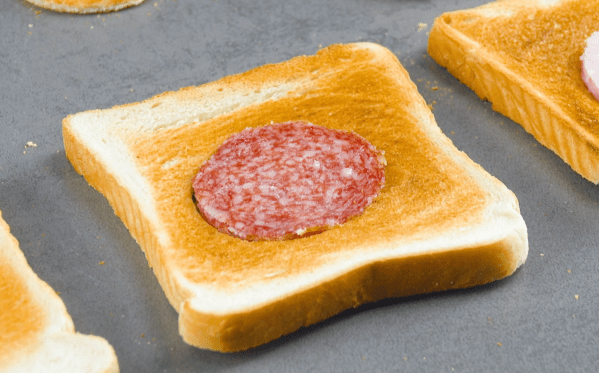• Placez 4 tranches de salami dans une autre tranche de pain grillé.