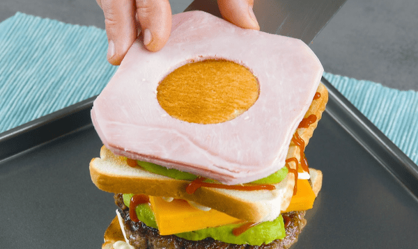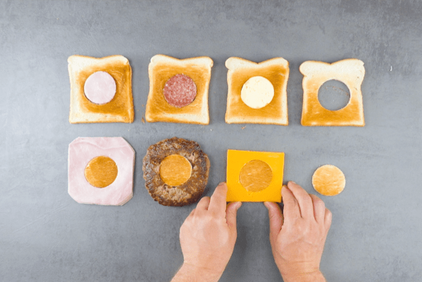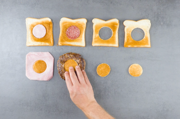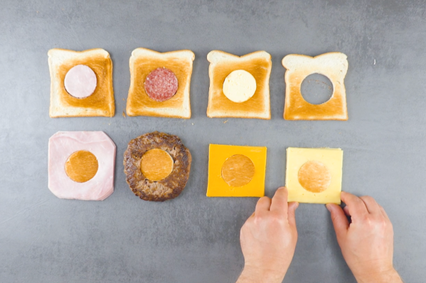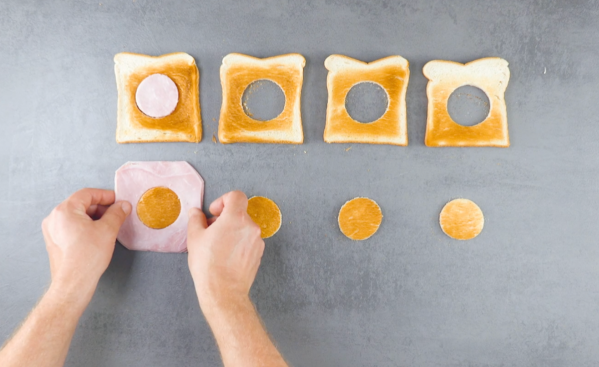 • Placez 4 tranches de jambon les unes sur les autres et utilisez le même emporte-pièce pour faire un trou au milieu. Placez le cercle de jambon dans l'une des tranches. Placez un cercle de pain de mie dans la pile de jambon avec le trou.