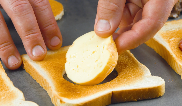 • Placez les tranches de cheddar les unes sur les autres et découpez également un cercle et remplissez le trou avec du pain grillé.