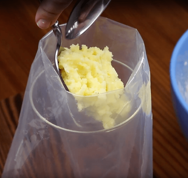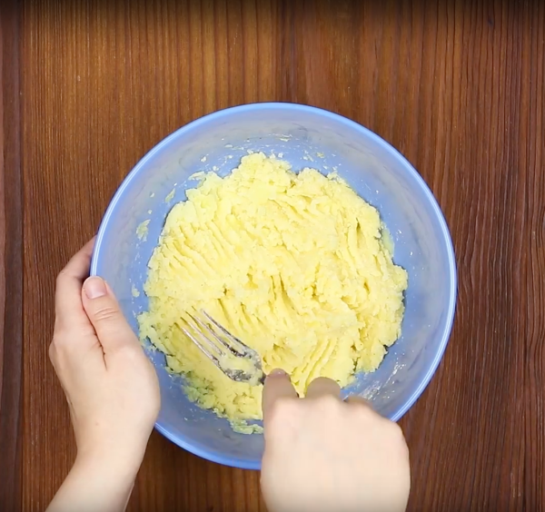 - À l'aide d'une fourchette, écrasez les pommes de terre cuites dans un saladier. Ajoutez ensuite tous les ingrédients restants, du parmesan au poivre. Mélangez bien le tout afin d'obtenir une mixture compacte et lisse.