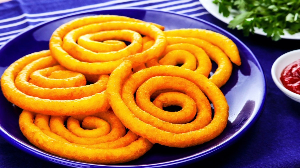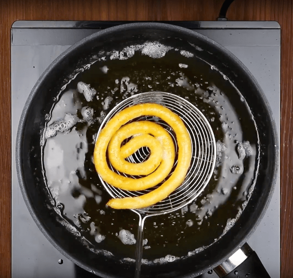 - Déposez la mixture dans une poche à douille à l'aide d'une cuillère. Dans une poêle, faites chauffer l'huile de friture et à l'aide de la poche à douille, faites couler la purée en forme de spirale dans l'huile.