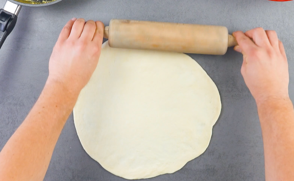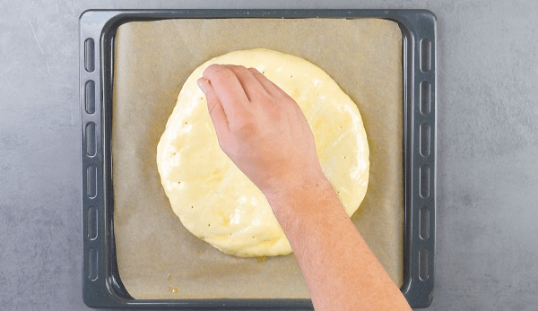 - Mettez la farine, le sucre, la levure, le sel, l'huile et le lait dans un saladier et mélangez le tout pendant environ 5 minutes jusqu'à obtenir une pâte lisse. Couvrez la pâte d'un torchon et laissez-la lever pendant une heure. Ensuite, divisez la pâte en deux et étalez les deux moitiés en cercles d'environ 28 cm de diamètre.