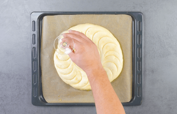 - Enfoncez le bol au milieu de la pâte de manière à former un creux en forme d'anneau. Ensuite, à l'aide d'un verre à vin tenu en biais, formez des demi-lunes tout autour de la pâte entre les trous.