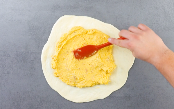 - Posez l'une des pâtes étalée sur une plaque de cuisson recouverte de papier sulfurisé et étalez le pudding dessus. Laissez un bord d'environ 4 cm tout autour.
