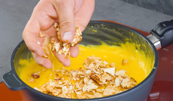 - Pour le pudding aux pommes, mettez la Maïzena, le sucre, les jaunes d'œufs, le lait et la vanille dans une casserole et faites chauffer le tout à feu doux en remuant constamment jusqu'à ce que le pudding se lie. Remuez ensuite encore 2 minutes à chaleur résiduelle. Écrasez les chips de pomme séchée avec les mains, ajoutez-les et laissez le pudding refroidir un peu.