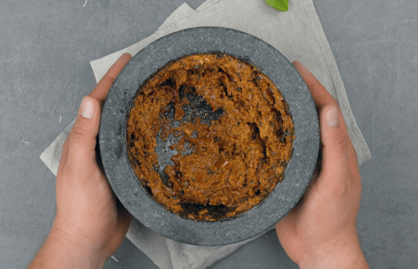 - Entre-temps, vous pouvez préparer le Pesto Rosso. Soit vous placez tous les ingrédients au mixeur, soit, encore mieux, vous utilisez un mortier pour le faire manuellement.