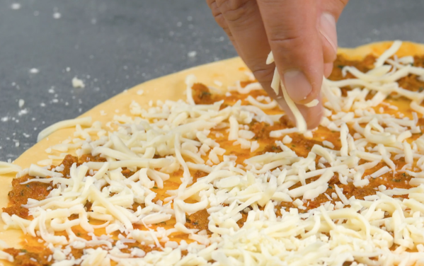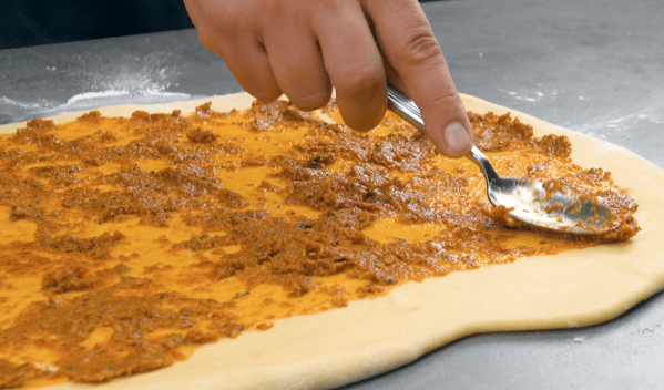 - Formez une boule de pâte sur un plan de travail fariné et étalez sur environ 50 x 40 cm. Badigeonnez la pâte de 3 cuillères à soupe de Pesto. Laissez une marge vide de 4 à 5 cm sur l’un des bords long.