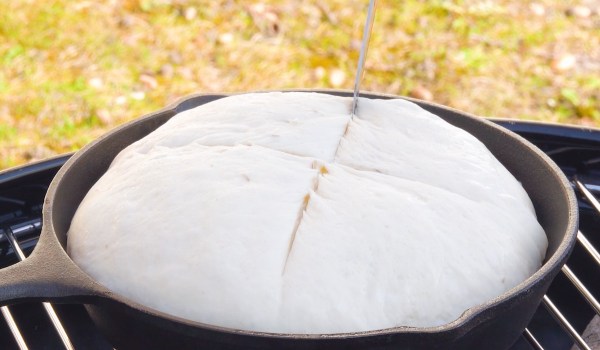 - Pétrissez tous les ingrédients du pain ensemble pendant environ 7 minutes, afin que tous les composants puissent bien se combiner. Laissez ensuite la pâte lever pendant 1 heure, à couvert. Placez ensuite la moitié de la pâte dans un moule en fonte et laissez-la reposer pendant encore 1 heure et demie. Faites une croix sur la surface pour que le pain puisse bien lever pendant la cuisson. Placez le pain et le moule sur le gril et faites-les cuire, couverts, pendant environ 40-50 minutes.Conseil : si vous voulez faire les deux pains en même temps, il est préférable d'utiliser deux petites poêles en fonte.