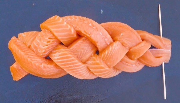 - Une fois le pain sur le gril, vous pouvez préparer le saumon. Coupez le saumon en quatre bandes dans le sens de la longueur. Fixez les bandes à une extrémité avec une brochette en bois, puis tressez les bandes.