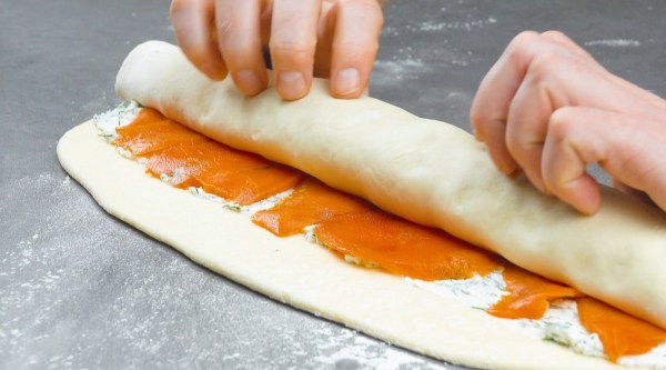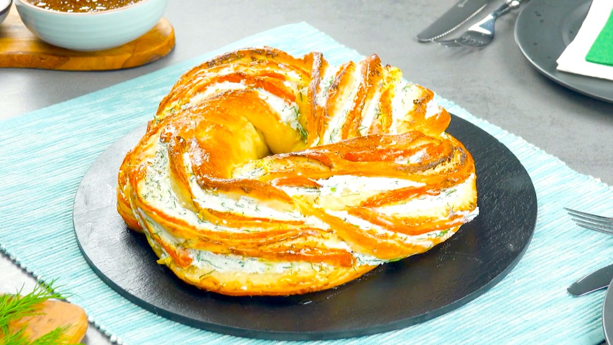 Du délicieux saumon fumé et une crème à la ricotta et à l’aneth enveloppés dans une pâte à pizza cuite croustillante : cette idée vous met-elle l’eau à la bouche ? Vous n’avez encore rien vu ! Car cette tresse de saumon est tout simplement inédite. Regardez :
