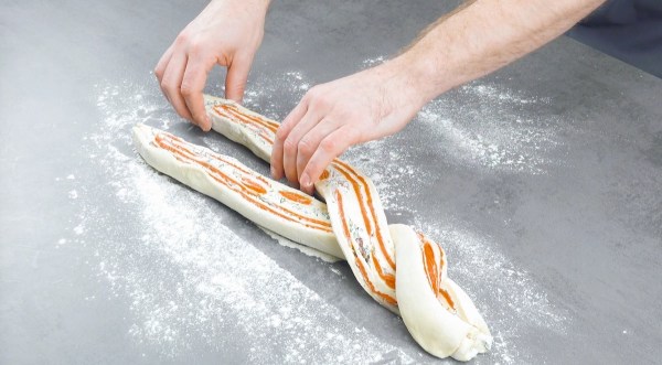 • Coupez maintenant le roulé de pâte à pizza en deux moitiés dans le sens de la longueur. Entrelacez ensuite les deux moitiés l'une sur l'autre, de manière à former une tresse.