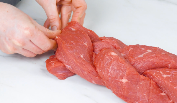 - Retirez la graisse et les tendons de la viande, puis coupez-la en deux dans le sens de la longueur afin de pouvoir l'ouvrir. Elle doit mesurer environ 130 cm de long. Coupez la viande deux fois de manière à obtenir trois boudins de 5 cm de large. Confectionnez une tresse avec les brins obtenus. Veillez à ce qu'il n'y ait pas de trous et fixez la tresse de viande avec une brochette en bois.