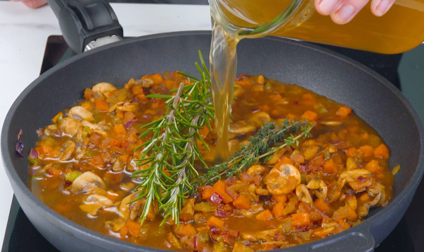 - Faites revenir les oignons, les champignons, la carotte et le céleri dans l'huile. Ajoutez ensuite le vinaigre balsamique, le romarin, le concentré de tomates et la moutarde. Versez ensuite peu à peu le bouillon de bœuf dans la poêle et laissez cuire le tout jusqu'à ce que la sauce épaississe légèrement.