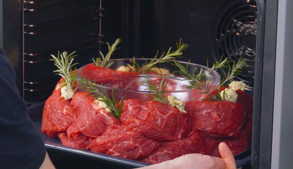 - Pour le beurre aux herbes, mélangez le beurre mou avec l'ail, le thym, le romarin, le sel et le poivre. Recouvrez ensuite la viande de beurre aux herbes et de brindilles de romarin. Assaisonnez également avec du sel et du poivre. Enfournez la plaque pendant 15 minutes à 220 °C, à chaleur tournante. Réduisez ensuite la température à 160 °C et laissez cuire la viande pendant 10 à 15 minutes supplémentaires. Laissez ensuite reposer la viande pendant au moins 15 minutes à température ambiante. Récupérez le jus de viande et mettez-le de côté.