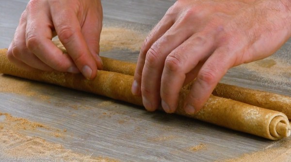 - Étalez la pâte feuilletée avec le rouleau à pâtisserie de façon à ce que le mélange sucre-cannelle s'incruste dans la pâte.