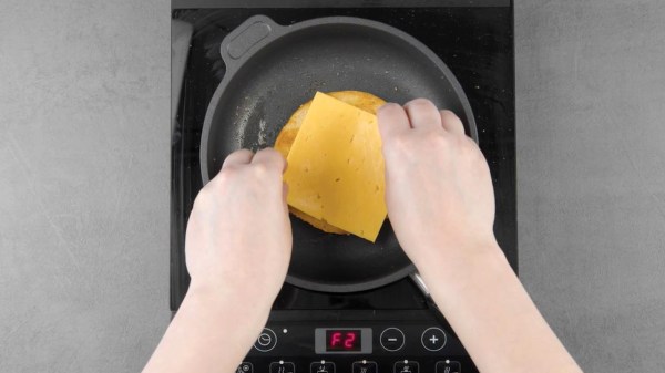 - Aplatissez-le légèrement avec une spatule, posez une tranche de fromage dessus et couvrez la poêle avec un couvercle pour que le fromage fonde bien.