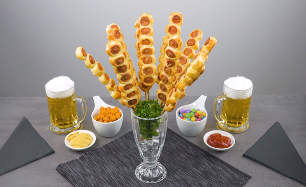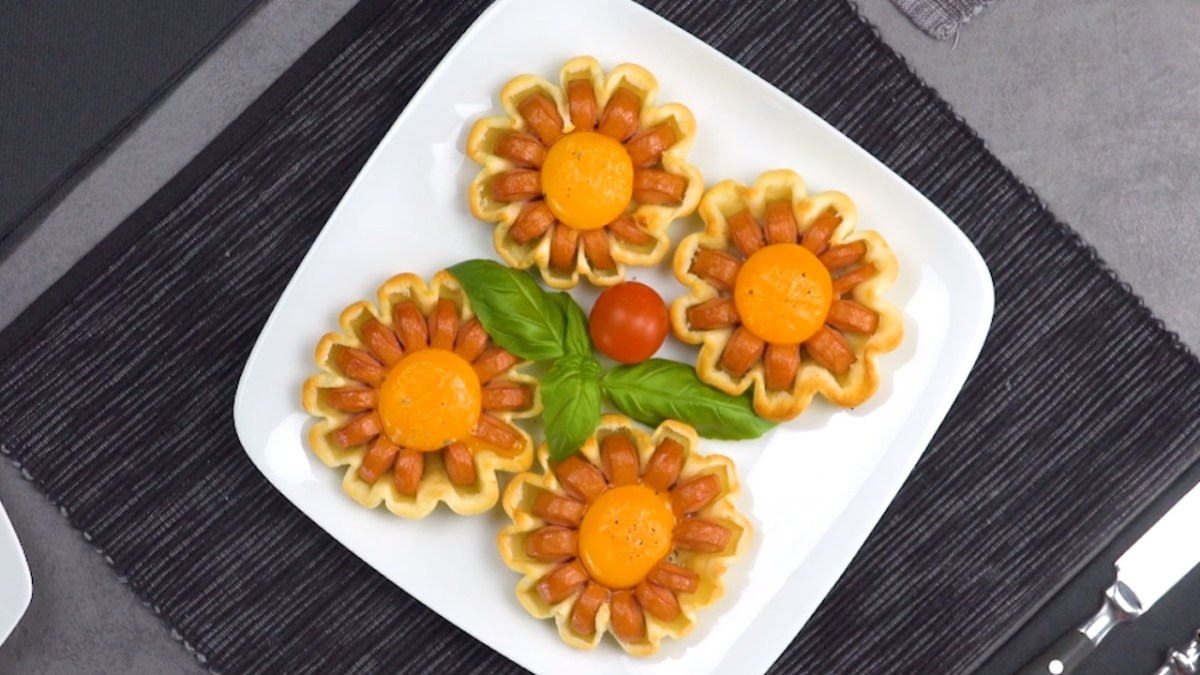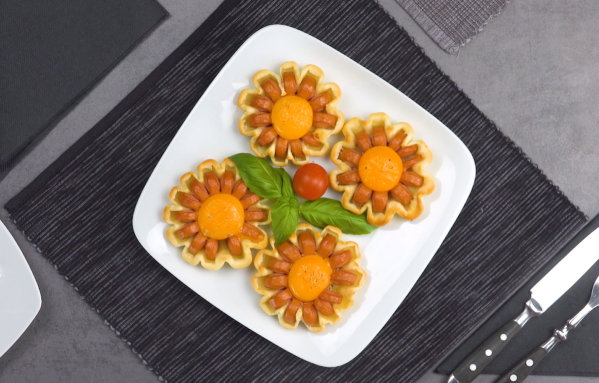 - 1.1) Enfoncez les brochettes dans les 4 saucisses, dans la longueur. Avec un couteau, faites des incisions espacées de 1-2 cm sans couper la saucisse entièrement.1.2) Retirez les brochettes des saucisses et formez des fleurs avec ces dernières.1.3) Formez ensuite quatre cercles de pâte à pizza à l'aide d'un petit récipient rond. Veillez à ce que le diamètre des cercles soit légèrement supérieur à celui des anneaux de saucisses.1.4) Placez les anneaux de saucisse sur les cercles de pâte à pizza et utilisez un cure-dent pour presser le bord de la pâte dans les espaces entre les saucisses.1.5) Saupoudrez le centre des fleurs de mozzarella râpée.1.6) Placez un jaune d’œuf sur la mozzarella et enfournez le tout à 175 °C pendant 10 à 12 minutes, à chaleur tournante.