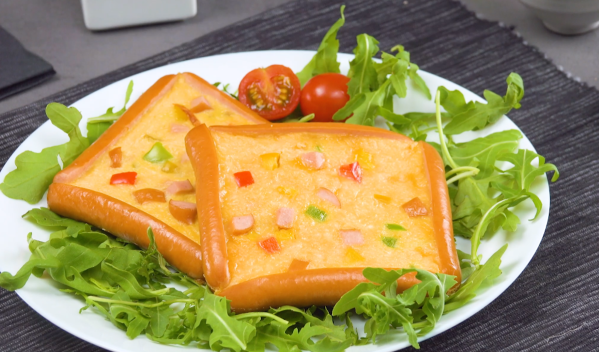 - 3.1) Coupez deux saucisses dans le sens de la longueur et formez un carré avec dans une poêle.3.2) Coupez la troisième saucisse en petits morceaux. Mettez un peu d'huile dans le cadre de saucisse et ajoutez les morceaux de poivron haché et de saucisse au milieu.3.3) Mélangez les œufs avec le parmesan, le sel et le poivre dans un saladier et mettez le mélange au milieu du carré dans la poêle. Salez et poivrez au goût et faites cuire à feu doux pendant environ 10 minutes.