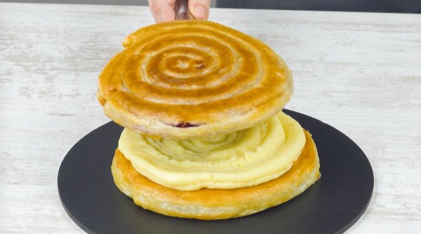 • Posez la purée de pommes de terre sur l'escargot garni de saucisses et posez l'escargot garni de chou rouge dessus. Étalez la purée sur cet escargot et déposez ensuite l'escargot garni de fromage par-dessus. Décorez le dessus avec des petites fleurs de purée de pommes de terre. Coupez les extrémités des six autres saucisses en diagonale, assemblez-les en petits cœurs et décorez le savoureux gâteau avec celles-ci. Fixez les cœurs avec des cure-dents si nécessaire.