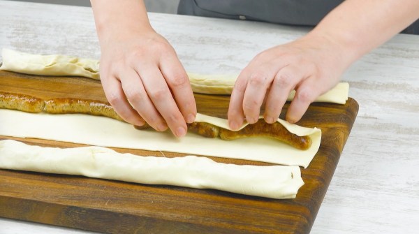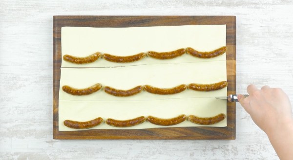 • Faites frire les 18 saucisses blanches dans une poêle, mais réservez-en six pour l'instant. Disposez les douze restantes en trois rangées sur une pâte feuilletée et coupez-la en trois bandes de même largeur. Roulez les saucisses dans la pâte feuilletée pour en faire des rouleaux.